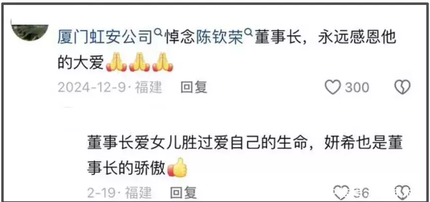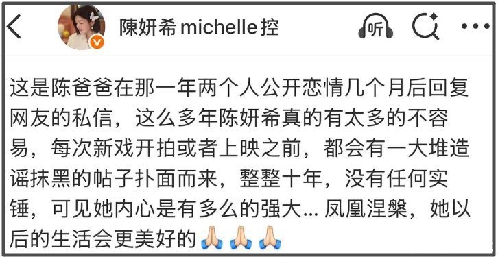 陈妍希在与陈晓结婚的近十年里,影视作品产出极少,承受最多的则是各种私生活污蔑,甚至家世都被质疑,而这一点也有网友帮忙澄清。陈妍希父亲去世后,有承受过恩惠的员工发布长文悼念,感恩他当时的无私大爱。