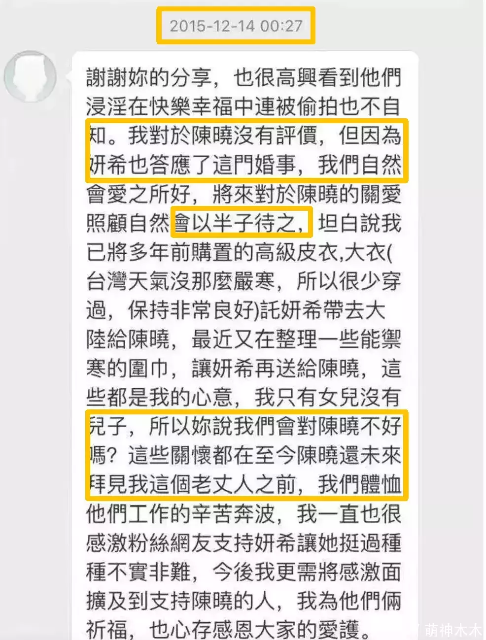 截图显示私信时间是2015年12月,陈爸爸感谢粉丝分享女儿的幸福,并长篇谈论了如何对待陈晓,他表示对陈晓不做评价,因为陈妍希答应婚事会把陈晓当作半个儿子对待,并已将自己多年置办的高级皮衣等转送给陈晓。
