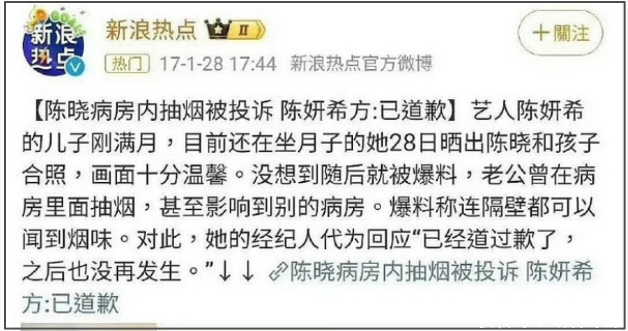 而类似的情况还发生在陈妍希坐月子期间。2017年,陈晓被爆料在产房抽烟影响到其他病房,当时陈妍希在产房坐月子,随后陈妍希经纪人对外回应称“已经道歉,此事再没有发生”。